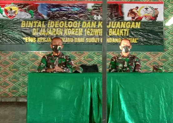 Pembinaan mental Ideologi dan kejuangan yang diberikan Kabintal Korem 162/WB Kapten Inf Alfian di Aula Serba Guna Kodim 1620/Loteng mengangkat tema “Etos erja di tinjau dari sudut pandang Bintal” diikuti ratusan personel TNI dan PNS jajaran Kodim Loteng.