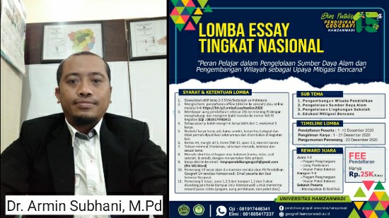 “Peserta dihajatkan dari siswa SMA sederajat se Indonesia. Tujuan diadakannya kegiatan ini untuk mengasah skill geografi siswa dalam hal menalar, menulis, dan berpikir spasial,” ungkap Korprodi Geografi, Dr. Armin, Selasa (01/12/2020).