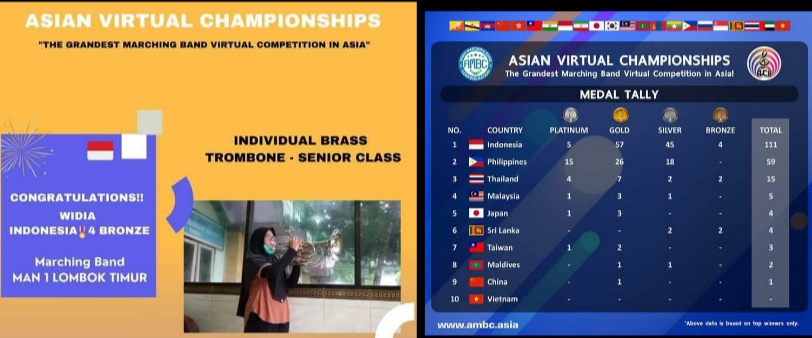 LOMBOKSATU.com – Seorang tim Marchingband MAN 1 Lombok Timur atas nama Widia sukses meraih perunggu pada Asian Virtual Championships (AVC) pada kategori lomba Individual Brass Trombone Senior Class mewakili Indonesia yang digelar dari bulan April lalu.